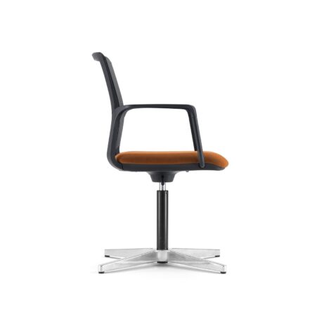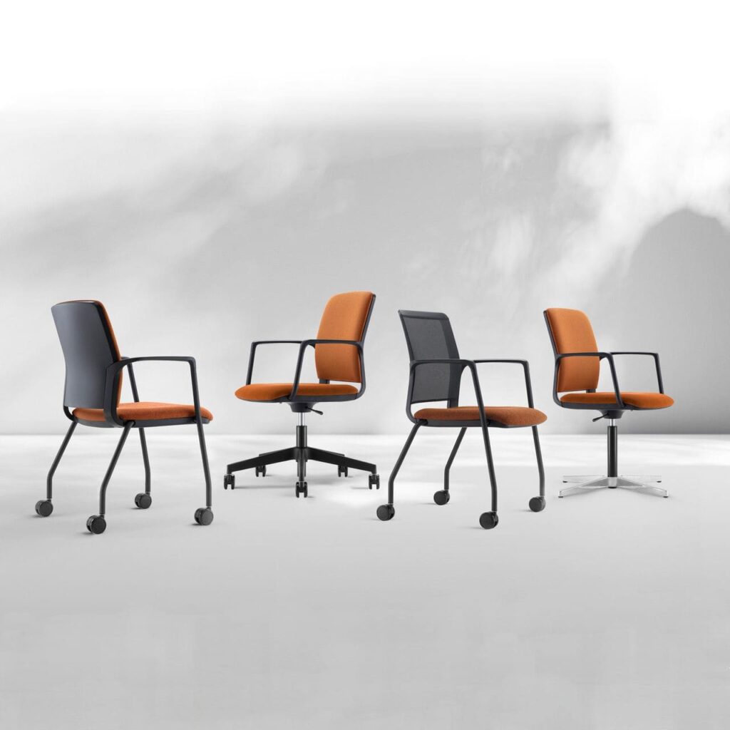 Complete family of meeting chairs with 5 frame options including stacking 4-legged & cantilever plus wheeled versions for movability.  All have an upholstered seat but choose between an upholstered or mesh back for preferred aesthetics with no cost difference.