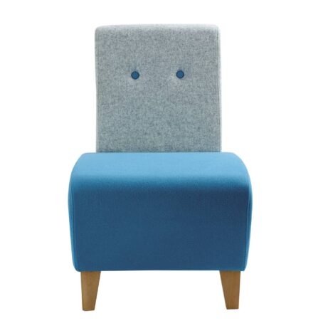 Fully upholstered single reception chair with shaped seat and natural finished wooden legs