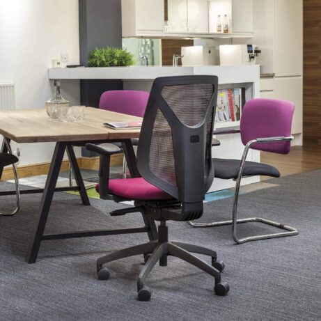 Duce Mesh is a high mesh back stylish task chair with a host of standard features designed to adapt and support the user with ease of use. Standard features include a ratchet back height adjustment, synchronised mechanism with body balance tension system and seat slide with a black mesh back and upholstered seat.