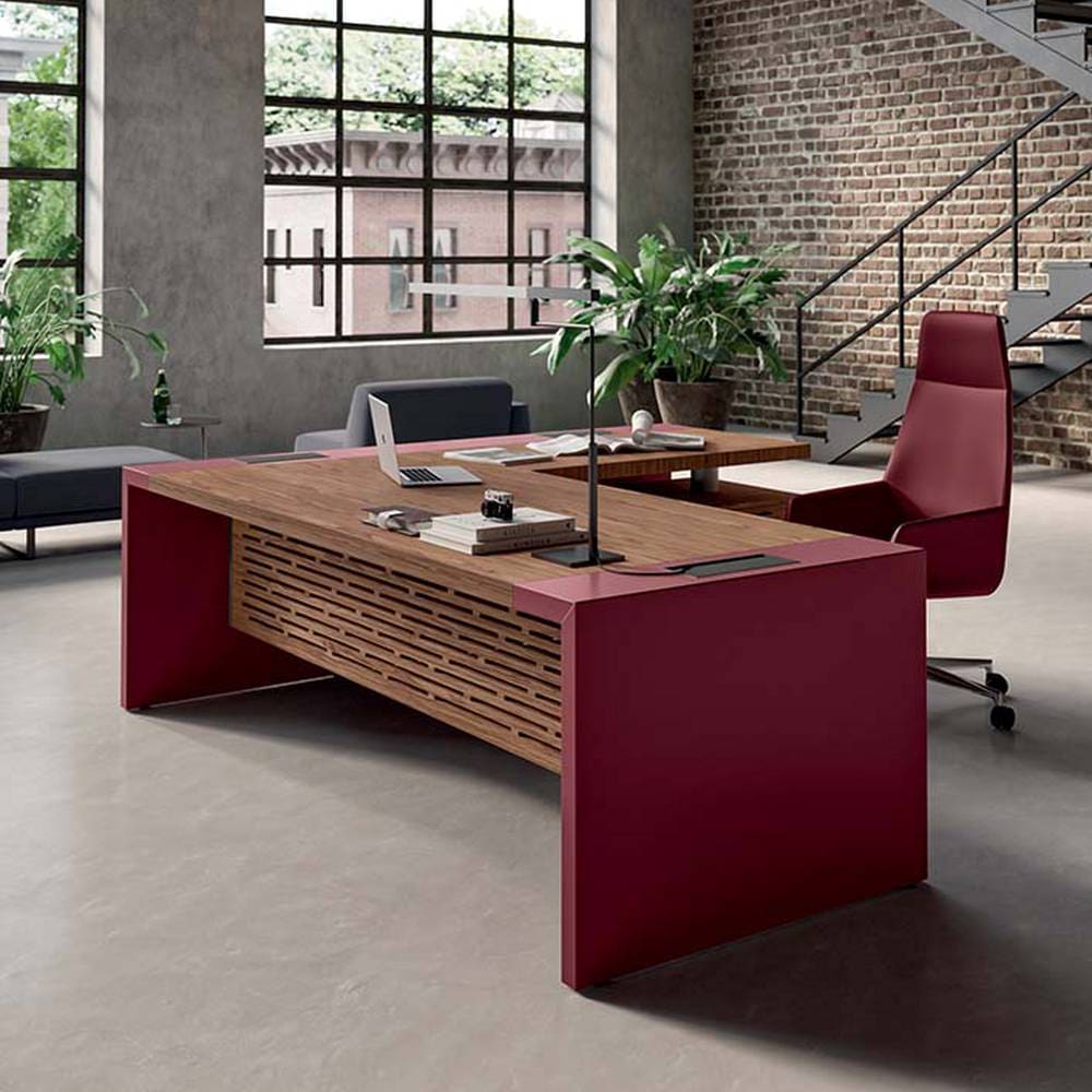 The evolution of the X10 line, with some modifications to shapes and finishings. With e-10, the legs and top engage in an unprecedented dialogue, devoid of a continuity solution, in a harmonious alliance and play of fullness and voids. The veneered wood, lacquered panelled or wooden legs and the top with leather inlays embellish the executive model. whereas other functional accessories, like the metal cable holder door, make the desk practical to use without undermining formal aesthetics. e-10 is also available in the version with a carved modesty panel, catering to international taste. Also available in the meeting table version, with different size and composition options.