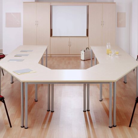 Training tables work well as dual purpose meeting tables, however they are more suitable for layouts in training environments. Available in either a semi-circle, trapezoidal or rectangular form, the table top can be ordered in one of ten MFC or two veneered wood finishes, and the leg frame is offered in silver as standard or can be upgraded to with a variety of our colour finishes to match other furniture in the setting.