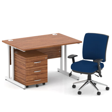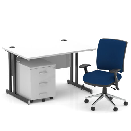 Impulse contract desk | 25mm tops | Heat resistant melamine finish | 18mm modesty panel | Double strut legs | Steel to steel fixings | Impulse mobile pedestal | Steel handles | Smooth running castors for mobility | Lockable drawers | Solid drawer construction | Chiro medium chair | Posture chair UK Chiropractic Doctor approved | Height adjustable back and seat | Pump lumbar support | Triple lever independent mechanism | Independent seat and backrest tilt angle adjustment | Gas lift tested up to 150kg | Usage: Task 24/7