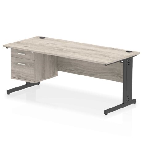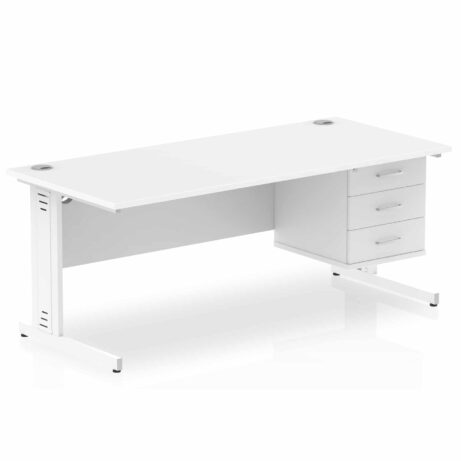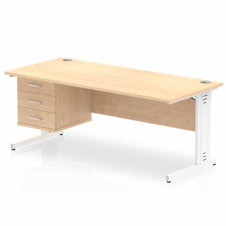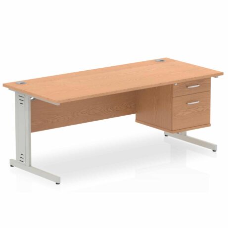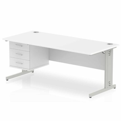 ? Impulse contract 1800 wide desk ? 25mm tops ? Wire management panel ? Heat resistant beech melamine finish ? 18mm modesty panel ? 2mm protective abs edging ? Silver coated double strut legs ? 2 cable ports ? Height adjustable feet ? Steel to steel fixings ? 2 modesty panel slots ? Deep set modesty panel (5?) allows for compatibility of most screen clamp fittings ? Fixed pedestal
