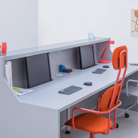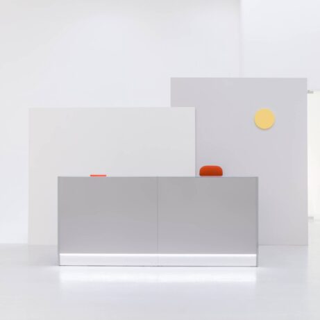 Minimalism backed by glass glitter – the Linea reception desk proves that less is more. The simple form is decorated with aluminium trim, and the backlighting of the lower part emphasises the glass front. Linea has a modern character, but its universal design makes it an interesting accent in classically arranged interiors. The modular design allows for customised configurations, so Linea can take the form of a straight or corner reception counter, depending on the function and size of the room. In areas where of prolonged contact with clients, the layout using the lower element, designed with the disabled in mind, works particularly well. The extended top increases functionality. The taller unit allows you to work while standing. Organising documents will be made easier with a capacious tambour cabinet or small cabinets on the tabletop.