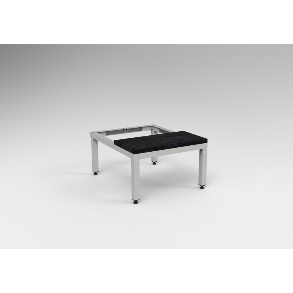 Steel locker stand with integrated bench, providing seating in space-limited environments where lockers are also required.