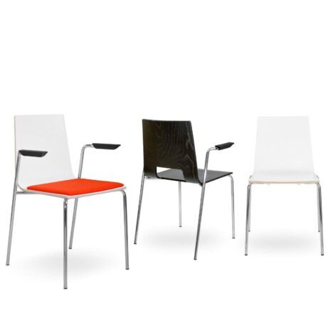 Multiply offers a modern design which is simple and compact, yet functional. The seat is supported by either a tubular steel four-legged frame or wooden four-legged base, available in multiple finishes. For further comfort, the finished design can include support arms and an upholstered seat pad or fully upholstered shell in a choice of fabrics. In summary, Multiply possesses simplicity and versatility, making it adaptable to a multitude of spaces and needs.