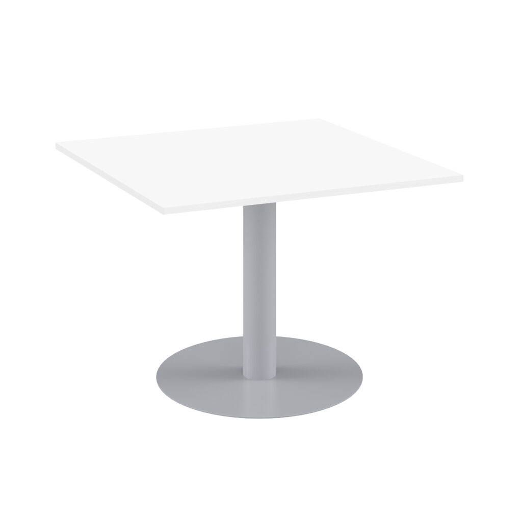 This contemporary meeting table has a square top and a single central leg, which gives unencumbered leg room. The wide base provides excellent stability and a range of top finishes allow this meeting table to fit a variety of office aesthetics.