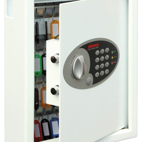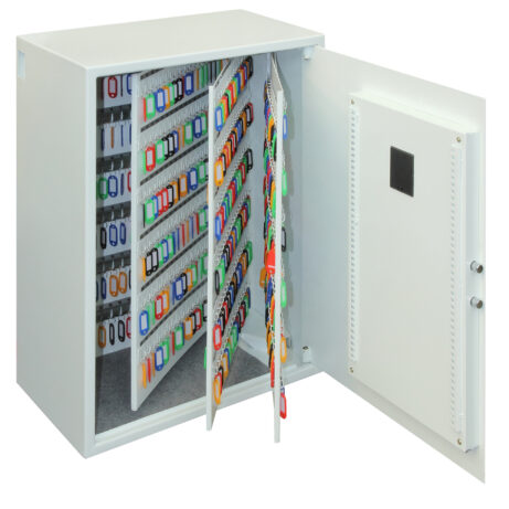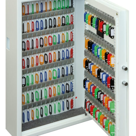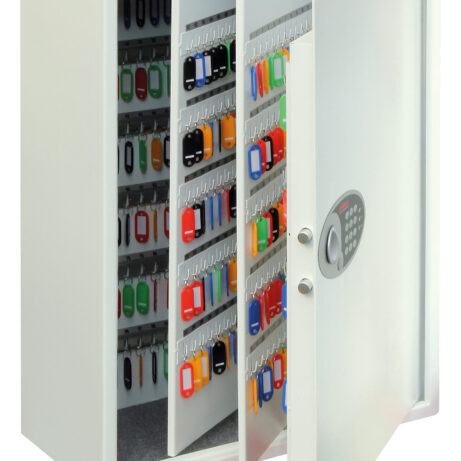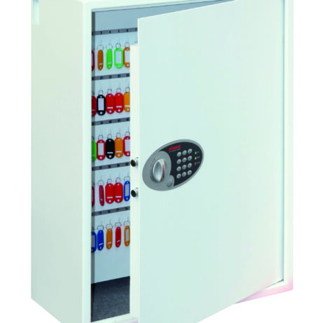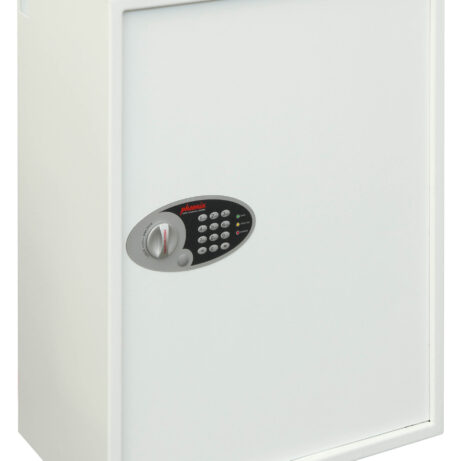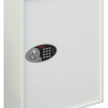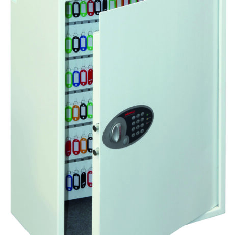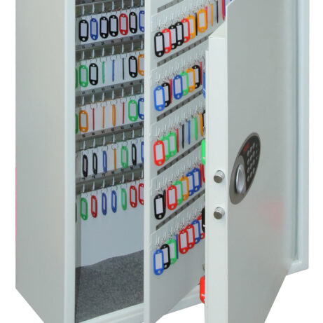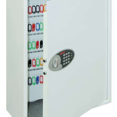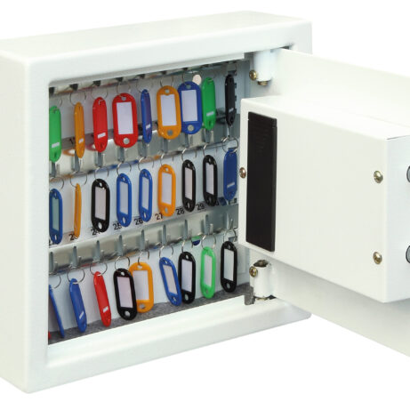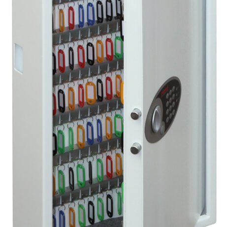 NO OF KEY HOOKS – 30, 48, 144, 300, 500 or 700 | LOCKING – Fitted with an advanced ‘user friendly’ electronic locking with anti-tamper or bounce solenoid locking System. For added peace of mind these safes are fitted with a key override facility should the code be misplaced (2 Keys supplied). | SECURITY – When bolted to a wall these key Safes provide defence against burglaries aimed at stealing car keys, house keys, office keys etc | FIXING – Ready prepared for fixing to the wall with bolts supplied | SPECIAL FEATURES – A unique key deposit slot allows keys to be deposited without the need to open the safe | DEPOSIT SLOT – 55H x 35W x 15Dmm | KEY TAGS – Supplied complete with a selection of coloured key rings | COLOUR – Finished in a high quality scratch resistant paint RAL9003 White.
