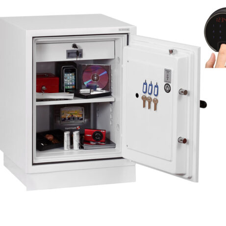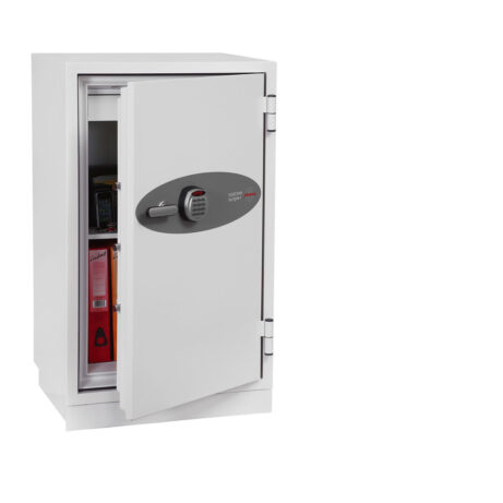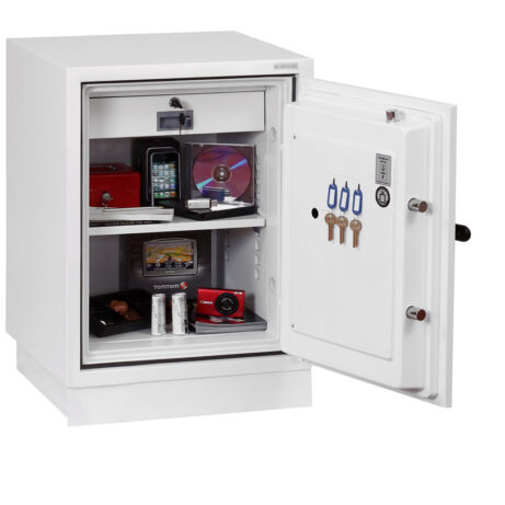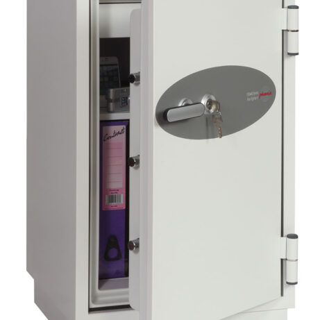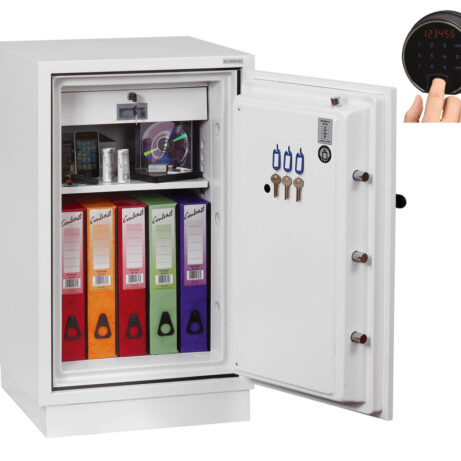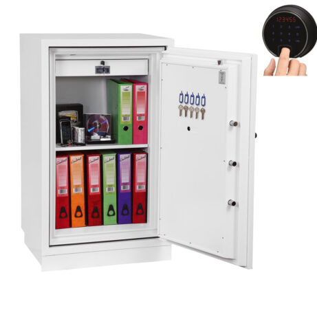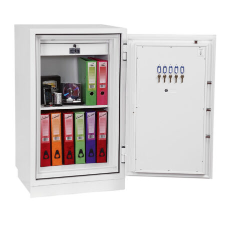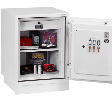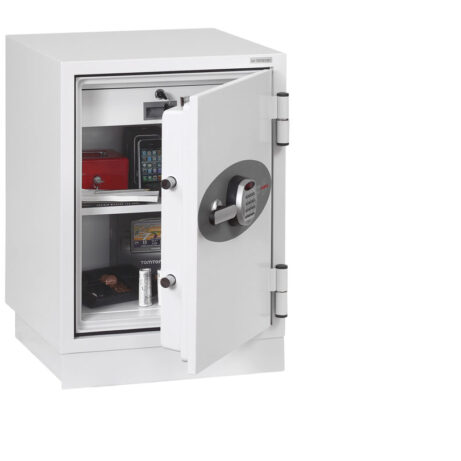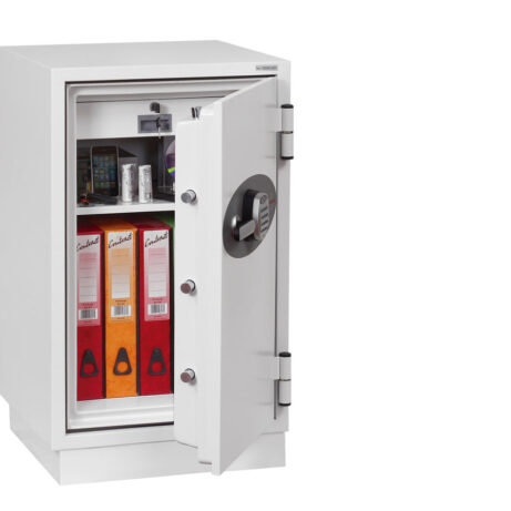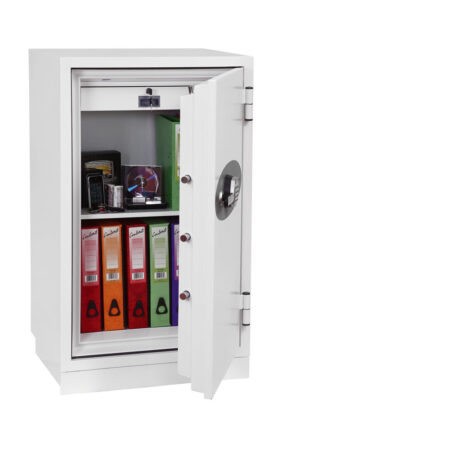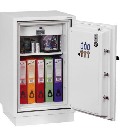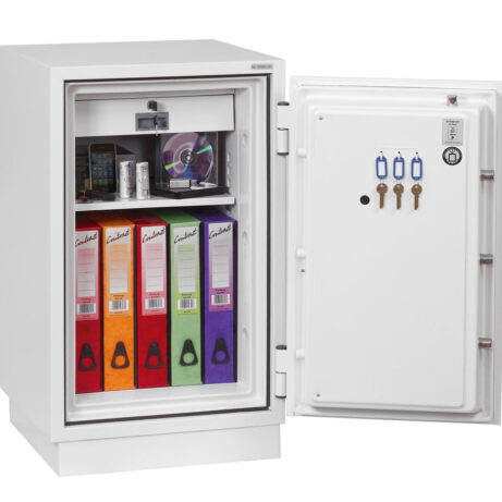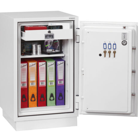 FIRE PROTECTION (PAPER) – Tested to Swedish NT Fire 017 – 90 Paper (Size 1 or 2) or 120 Paper (Size 3), providing up to 90 or 120 minutes fire protection respectively for paper documents | FIRE PROTECTION (DIGITAL MEDIA) – Tested to MTC – DIP120 – 60DM fire test standard, providing 60 minutes fire protection for digital media, DVD’s, USB memory stick and hard drives | SECURITY PROTECTION – The safe is recommended for an overnight cash risk of £2,500.00 or £25,000.00 valuables | DROP TEST – Fire and impact tested from 9.1 metres for resistance to the impact of falling through the burning floors of a building | FITTINGS – Each safe comes complete with height adjustable shelf and lockable cash/valuables drawer | FIXING – Ready prepared for floor fixing with fixing bolts for concrete supplied | SPECIAL FEATURES – Fitted with automatic slam shut door locking | COLOUR – Finished in a high quality scratch resistant paint RAL9003 White
