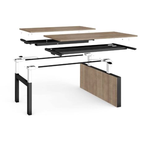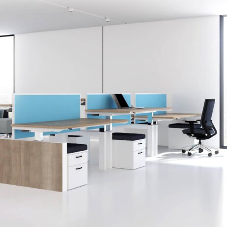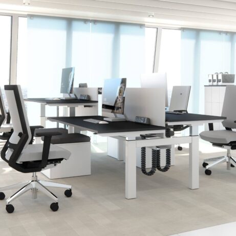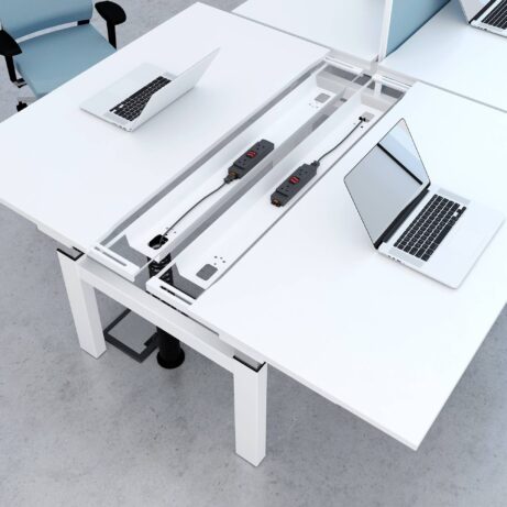 Progress offers complete flexibility with options including fixed height and gas strut height adjustment. Each option can be fitted after the initial installation, should the user’s requirements change. For example, a fixed height workstation can be converted to include height adjustment by swapping the leg uprights only. All components are fully interchangeable for maximum flexibility. The sit-stand aspect brings significant health benefits encouraging wellbeing within the office environment. Height adjustable workstations offer height variation from 685mm to 1185mm. Double benches are supplied with sliding tops as standard, enhancing the flexibility of the desking system. Horizontal wire management is inclusive under each desk top on both the single and double benches. Decorative slab end panels can be fitted to both single and double workstations to enhance the aesthetics at the end of a run of workstations, offering a more executive appearance.