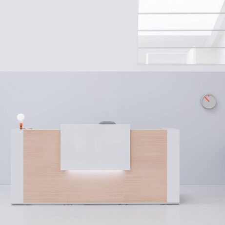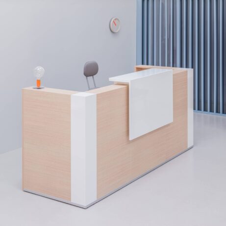 Classic and timeless — Tera reception desk meets the expectations of those who favour simplicity and universal forms. The combination of glossy HPL elements, with white or wood-like melamine plate that breaks the conservative patterns, is subtly indicating elegance and prestige. Modular desk provides possibilities of creating various layouts: from small to complex workstations depending on the needs. By employing the low module with overhang worktop, the desk eases the communication with disabled customers. Tera is a perfect fit for a reception of law firms or hotel lobbies where it delicately highlights the high quality of service.