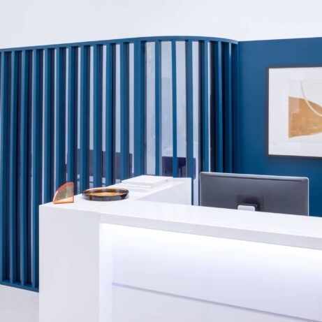 Modern character and dynamic form – Valde reception desk was designed to meet the requirements of a contemporary reception. Visually attractive combination of glass, aluminium and high gloss laminates creates an elegant, but not overwhelming whole. Modular construction allows to freely customize and extend the layouts. Corner desk, semi-circular, straight or an irregular shape – with Valde every configuration is possible. The overhang worktop of the low module is an indisputable advantage that is a convenience for disabled customers. Furthermore, the chosen colour can function as a complementary element of the visual identification of the company.