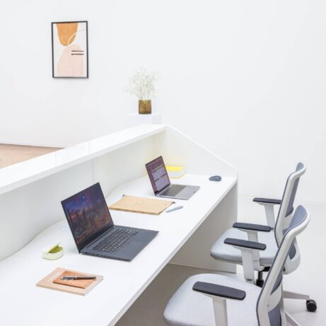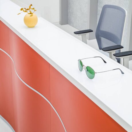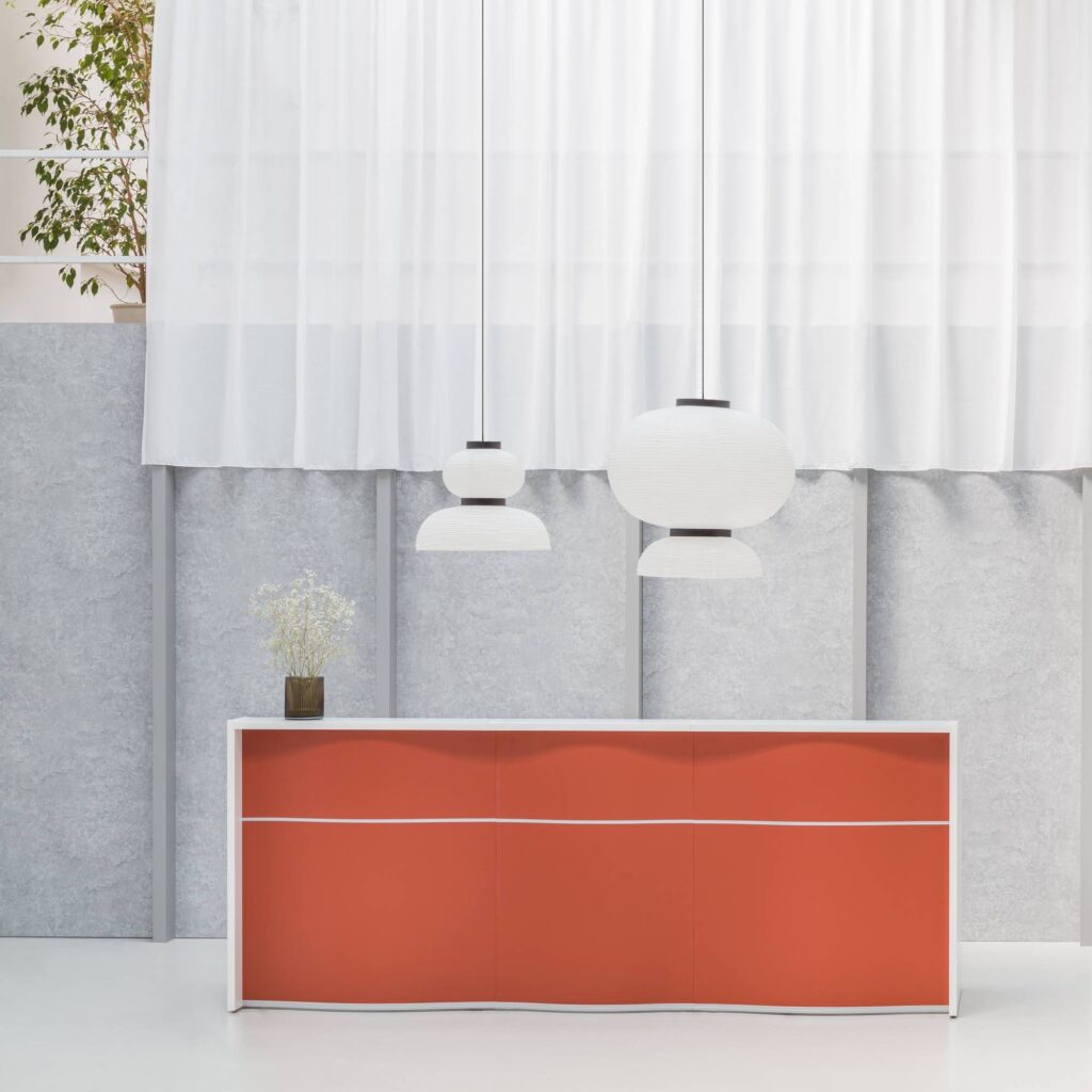 Wavy line reflecting strength and tranquillity of the dormant ocean — Wave reception desk stands out with is design. Simultaneously luxurious and professional character of this piece of furniture is emphasized by a white gloss of the worktop, glossy front and decorative aluminium bar. Modular construction allows creating customized configurations. Snail shaped reception helps to save space and at the same time provides functionality. An extended version of the desk can consist of several workstations whereas employing a low module with overhang top is a convenience for disabled customers. The characteristic form don’t overwhelm the interior, but it attracts attention