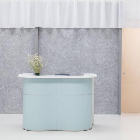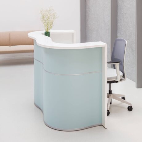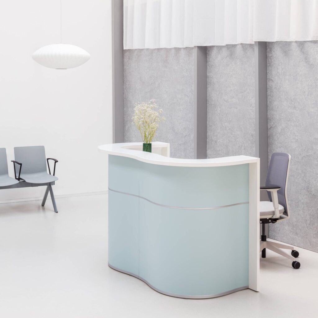 Wavy line reflecting strength and tranquillity of the dormant ocean — Wave reception desk stands out with is design. Simultaneously luxurious and professional character of this piece of furniture is emphasized by a white gloss of the worktop, glossy front and decorative aluminium bar. Modular construction allows creating customized configurations. Snail shaped reception helps to save space and at the same time provides functionality. An extended version of the desk can consist of several workstations whereas employing a low module with overhang top is a convenience for disabled customers. The characteristic form don’t overwhelm the interior, but it attracts attention